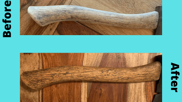At this point, the handle was ready for its new protective coat. It’s better to do many thin layers than one thick layer. I used tung oil because that’s all I had, but you can use linseed, hemp, teak, or walnut oil. These oils can be self-combustible so be careful.